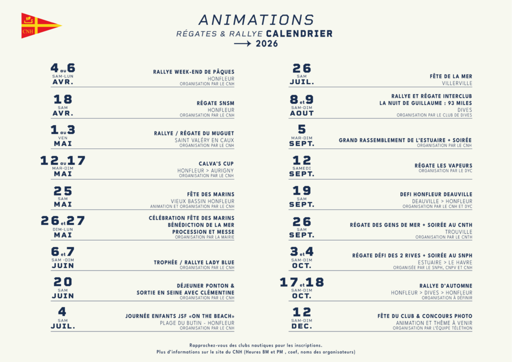 Le Cercle Nautique Honfleur (CNH) est un club nautique très actif qui, tous les ans, établit un programme d’animations ouvertes aux membres s’étant acquittés de leur cotisation.