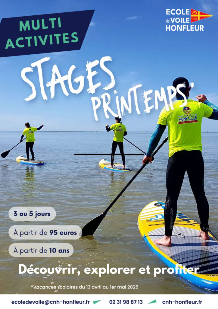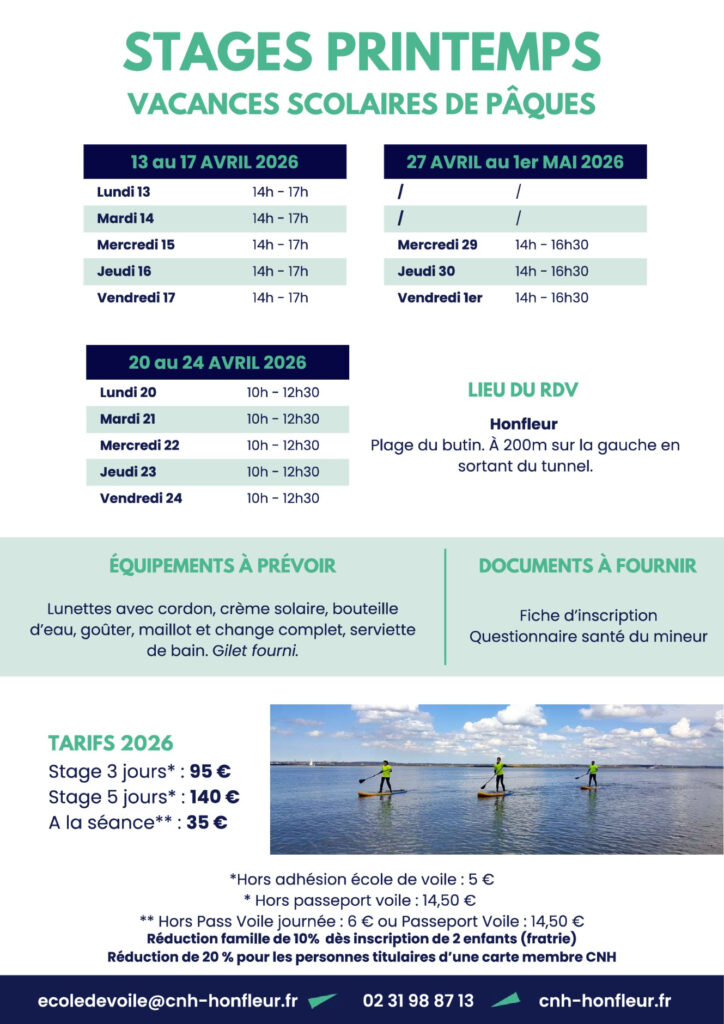 Prévoir : Des tennis ou chaussons de voile, un coupe-vent, une polaire ou autre protection (lunettes soleil, casquette, crème) en conséquence de la météo, des affaires de rechange (penser aux chaussettes !), bouteille d’eau, gouter, serviette de bain. Gilet de sauvetage fourni.