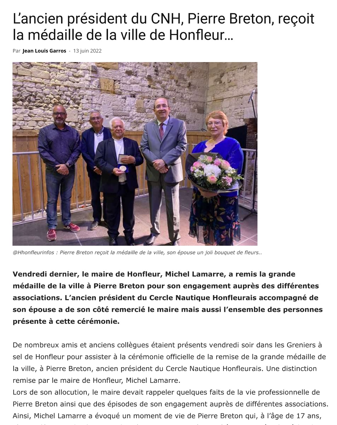 Pierre Breton, ancien président du Cercle Nautique Honfleur, a reçu vendredi 10 juin la médaille de la Ville par les mains du Maire de Honfleur, Michel Lamarre.